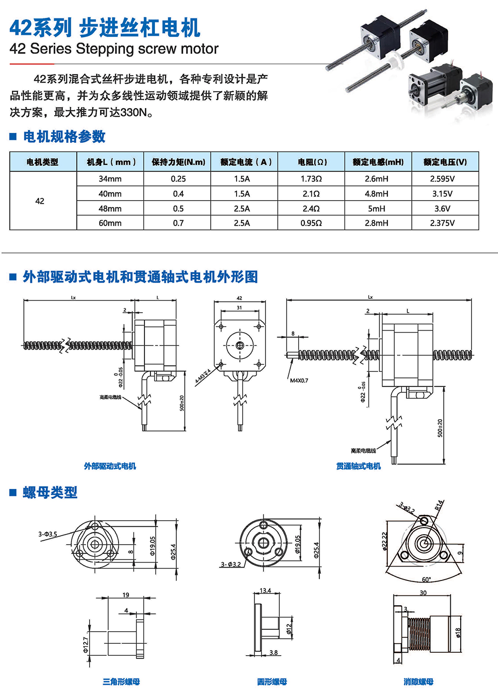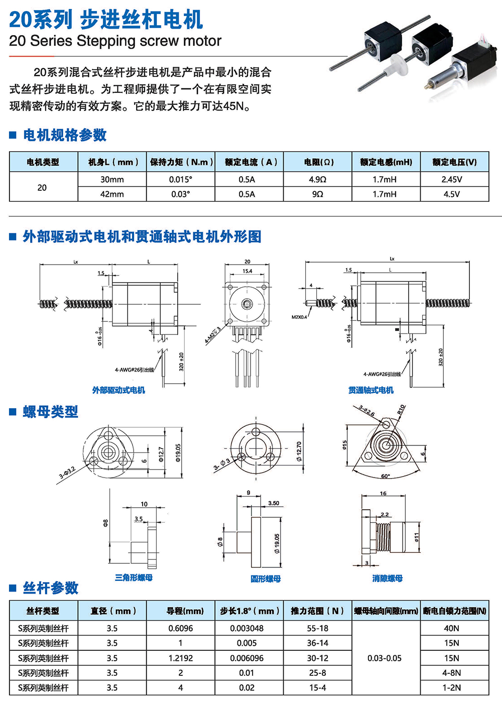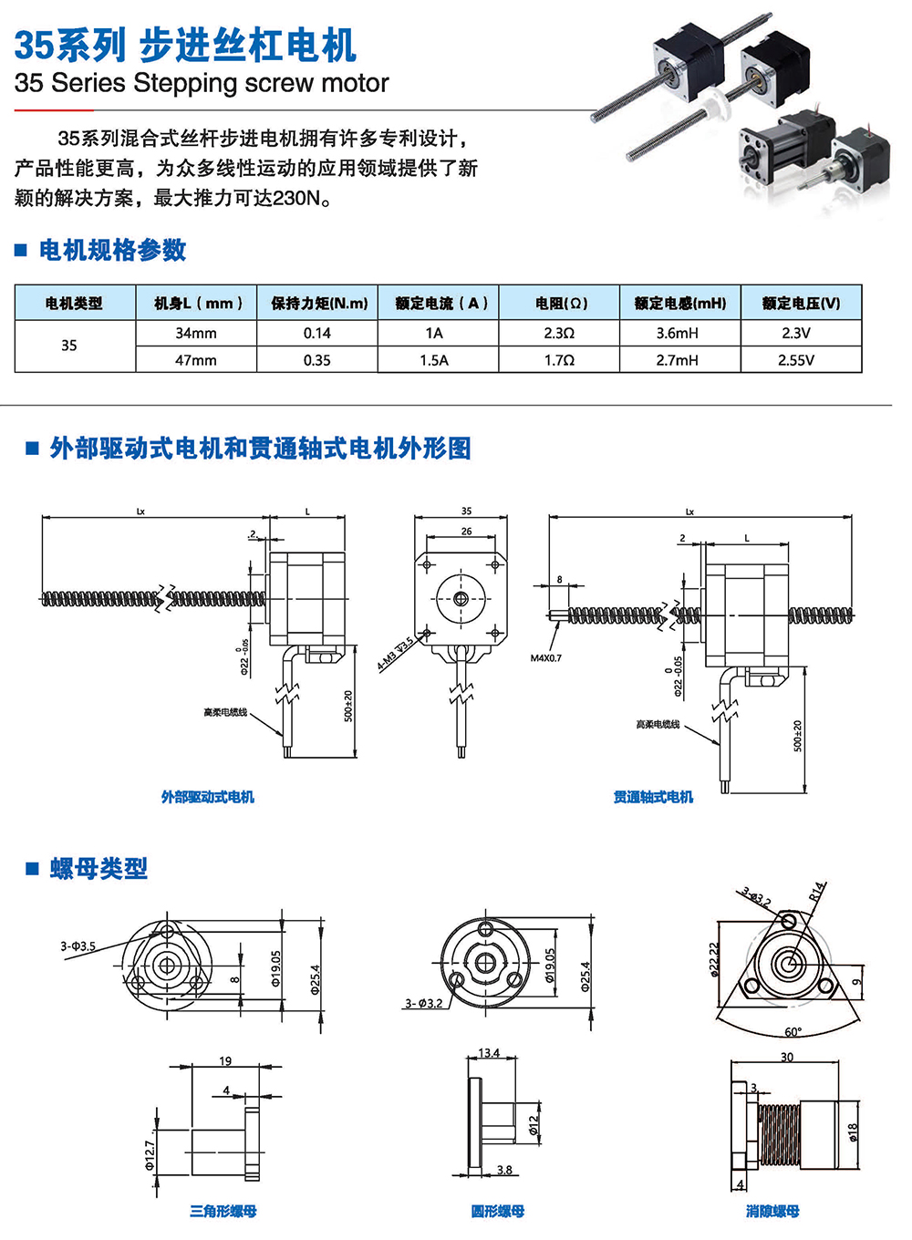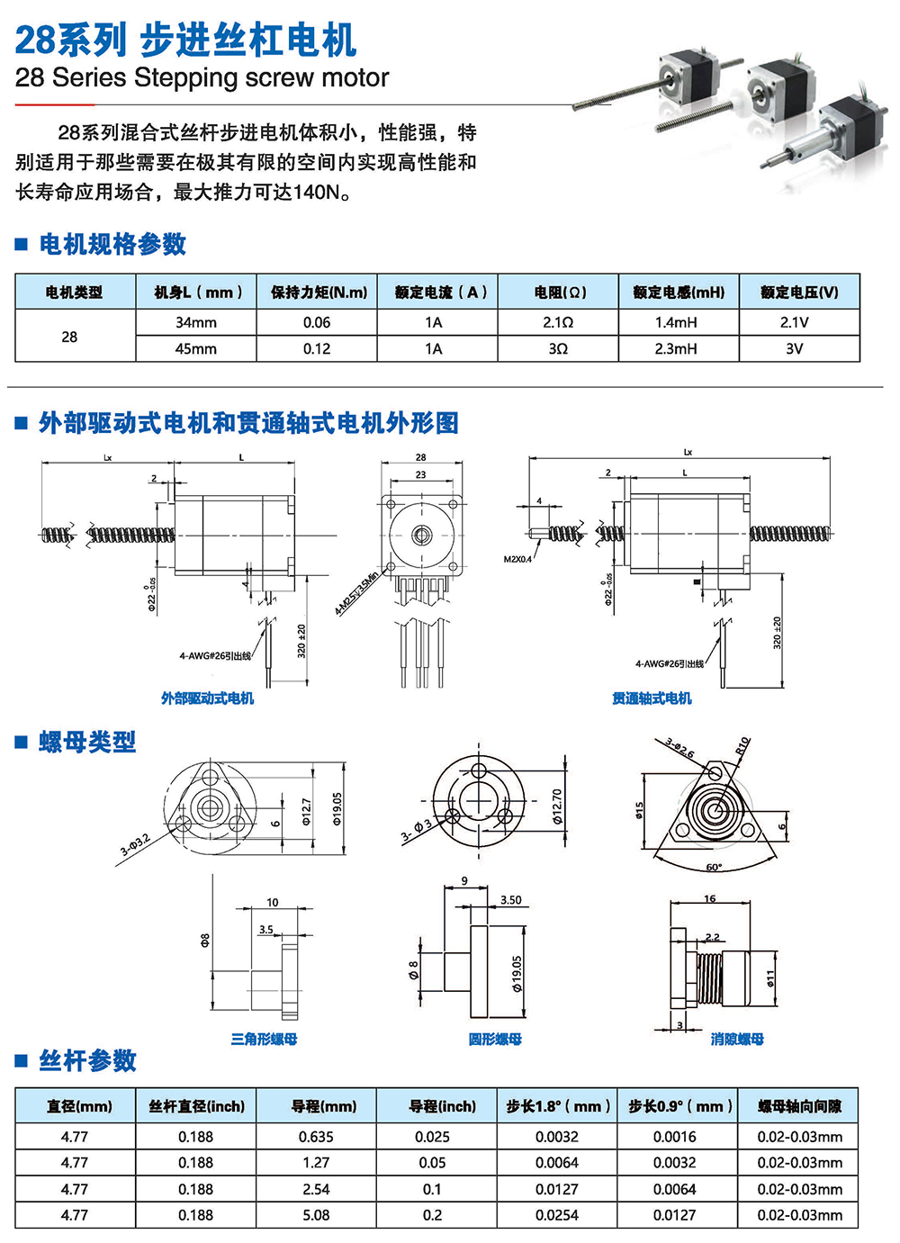 絲桿步進電機系列產(chǎn)品提供了簡單有效的直線運動方案,簡化了從旋轉(zhuǎn)運動到 直線運動的轉(zhuǎn)化過程,它將運動的轉(zhuǎn)換過程在電機本體完成,不再需要皮帶、齒輪 齒條、聯(lián)軸器和其他機械部件來實現(xiàn)旋轉(zhuǎn)運動到直線運動的轉(zhuǎn)換,大大節(jié)省了零部 件的采購成本和系統(tǒng)組裝時間,有效解決了因多次轉(zhuǎn)接造成的精度損失,提高 了結(jié) 構(gòu)空間的利用率和定位精度。我司的產(chǎn)品結(jié)構(gòu)簡單、緊湊,適用于500mm行程內(nèi)運 行,步進分辨率小為0.0015mm,推力可達200多公斤力。