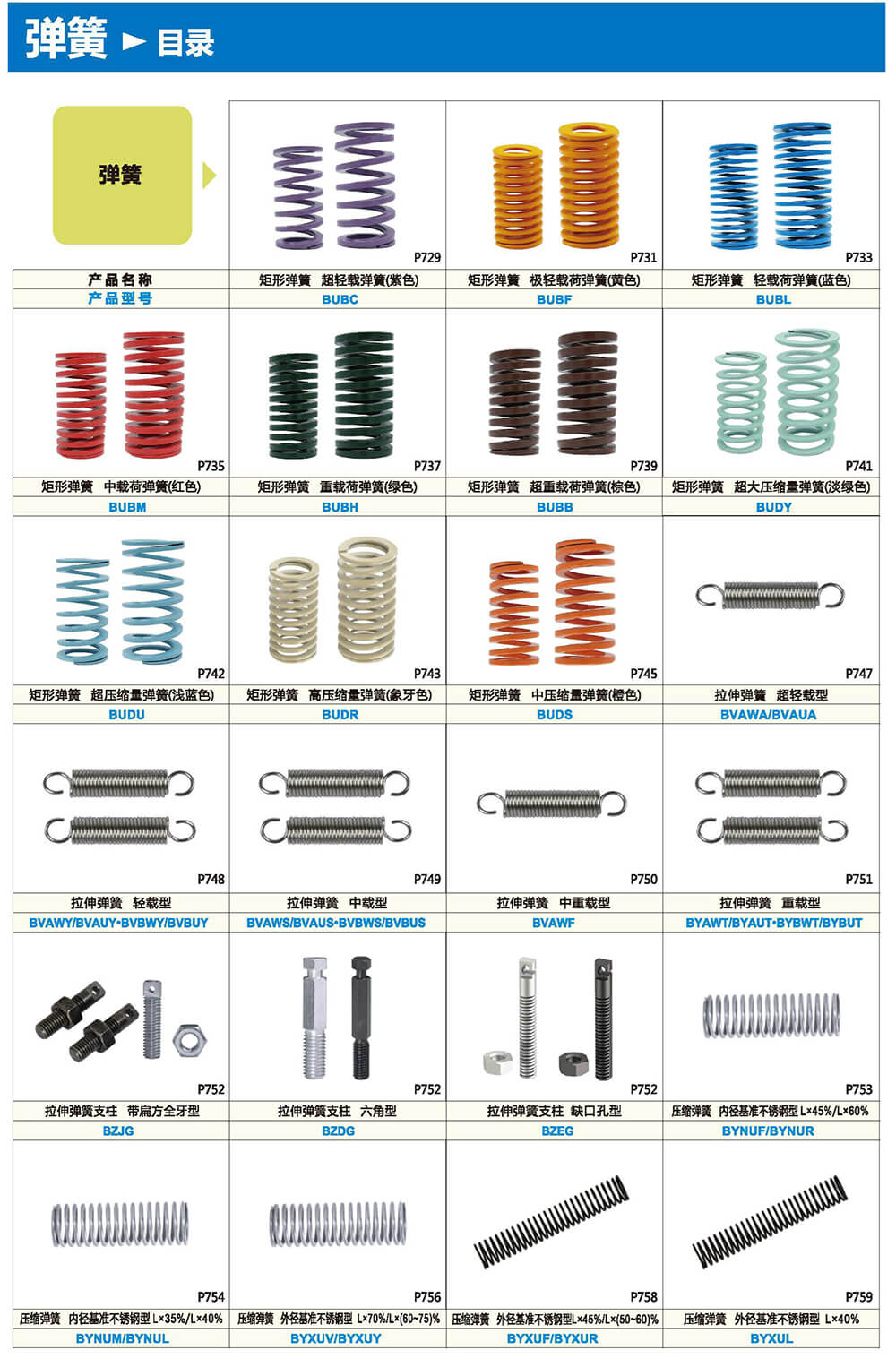 2.矩形截面壓縮彈簧:性質(zhì)和圓形截面圓柱螺旋彈簧相似,區(qū)別在于它所用的材料截面為矩形。在同樣空間條件下,矩形截面螺旋壓縮彈簧剛度更大,吸收的能量更多。
