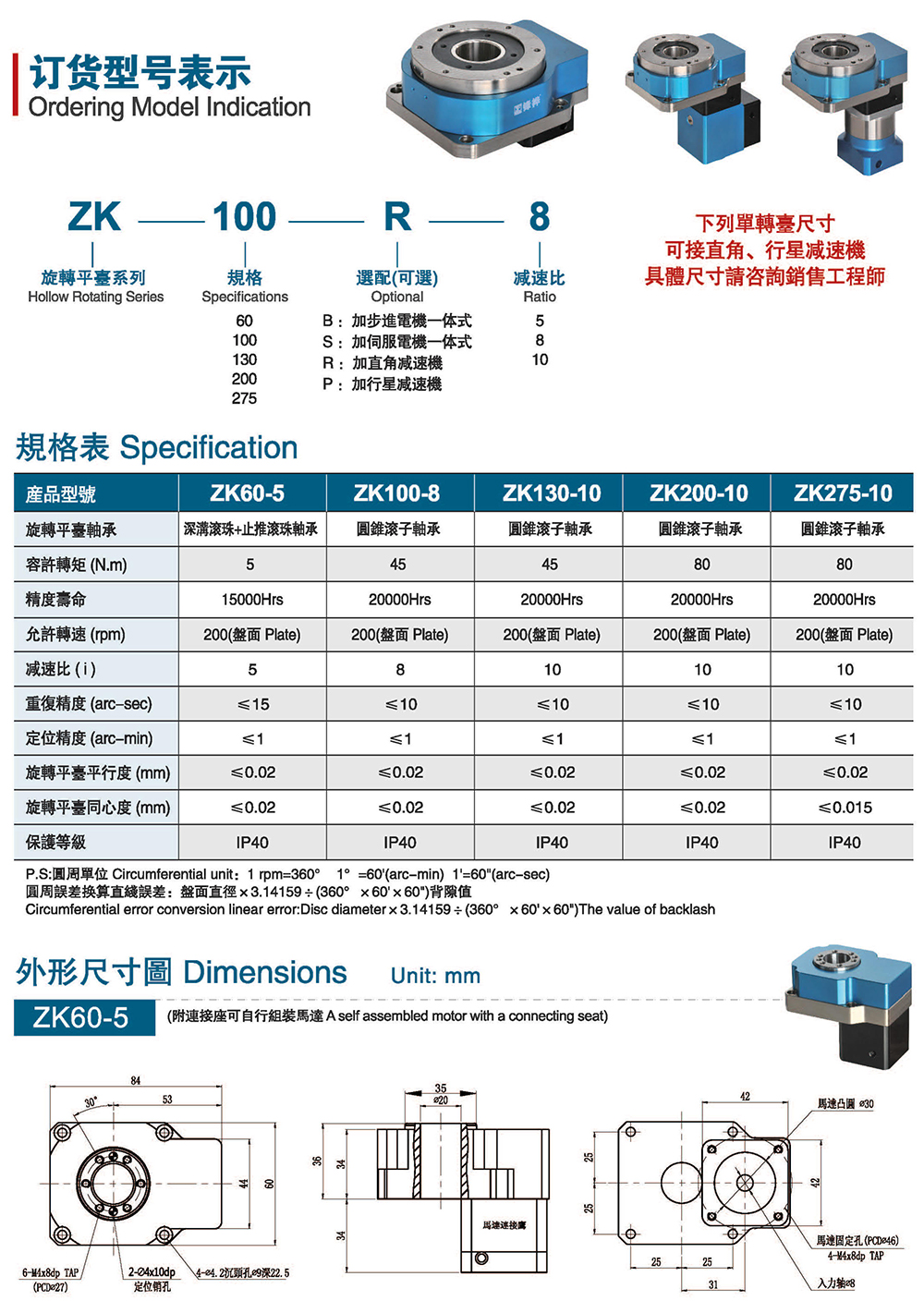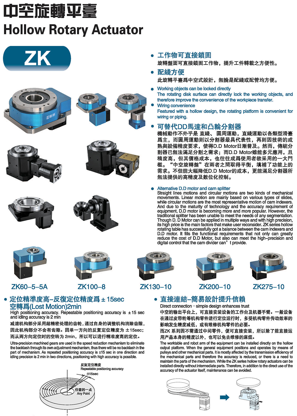 中空的輸出平臺上,可直接安裝設(shè)備的工作臺及機器手臂。一般設(shè)備在通過皮帶輪等機構(gòu)零件進行定位運行時,多受機構(gòu)零件傳動效率的影響發(fā)生精度減低,或有維修機構(gòu)零件的必要。而zK系列因不需通過中間零件,便可直接安裝,所以除了能直接運用產(chǎn)品本身的精度以外,也可以免去維修的麻煩。